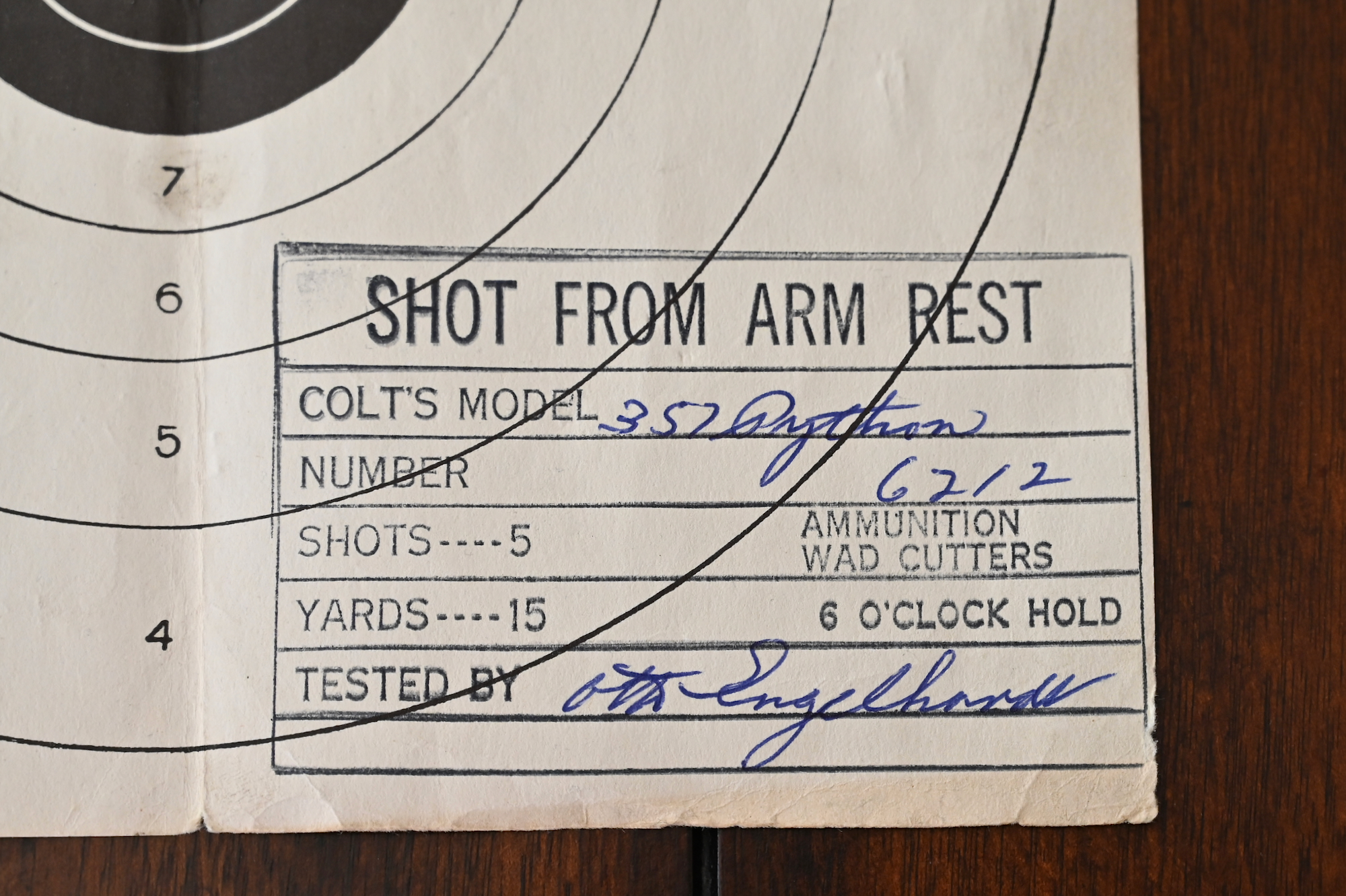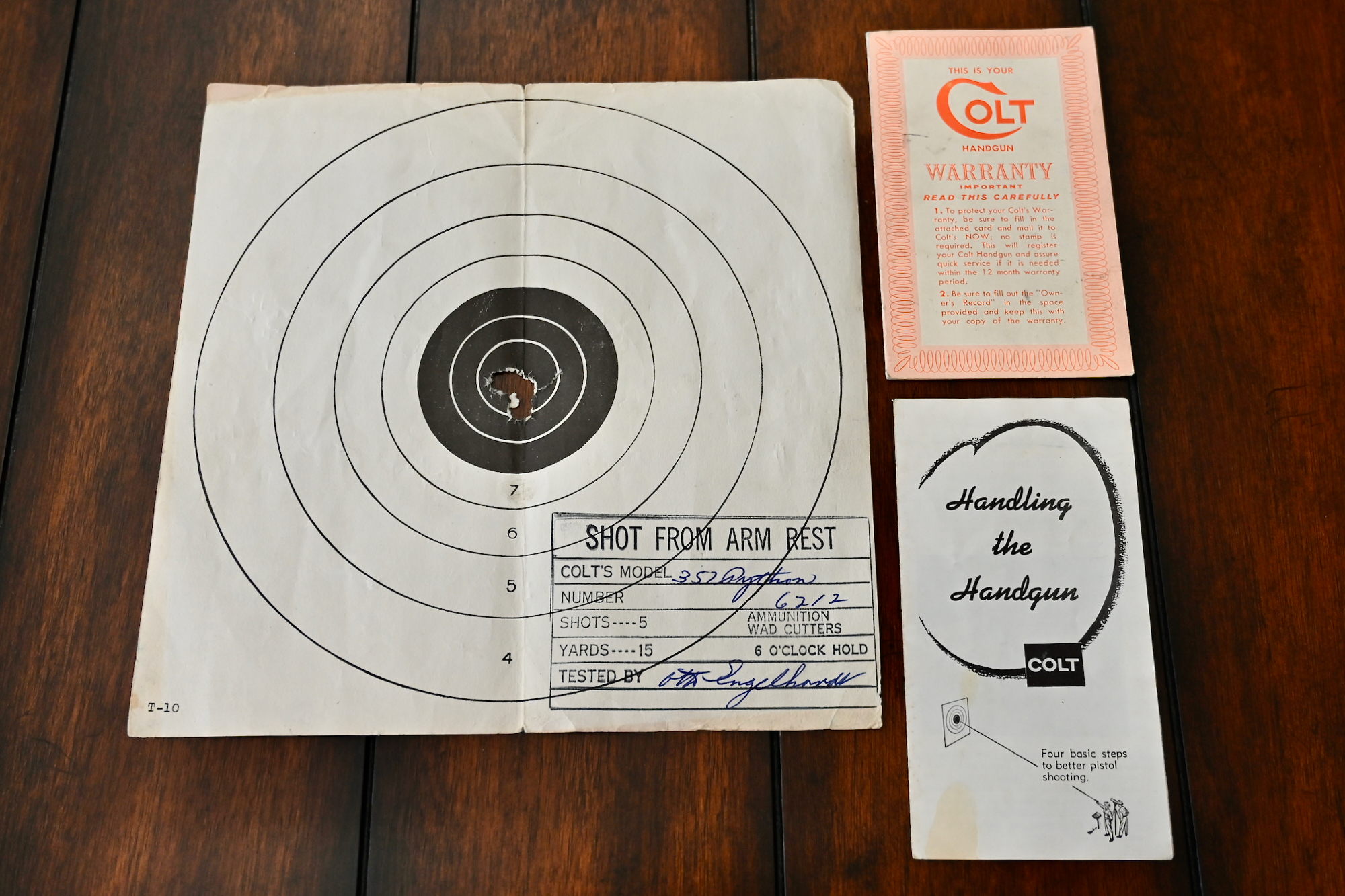 As mentioned previously, the package includes the factory original Colt two-piece faux woodgrain box, which is numbered to the gun (shows some storage wear and tape repairs), the original Colt warranty booklet, the original ‘Handling the Handgun’ brochure, as well as the original Engelhardt signed test target.