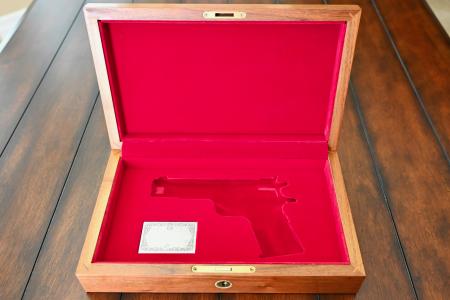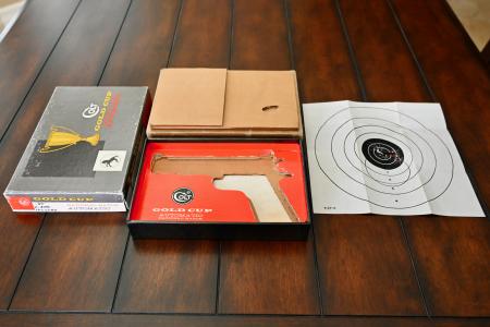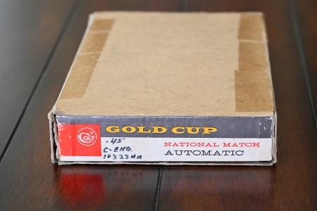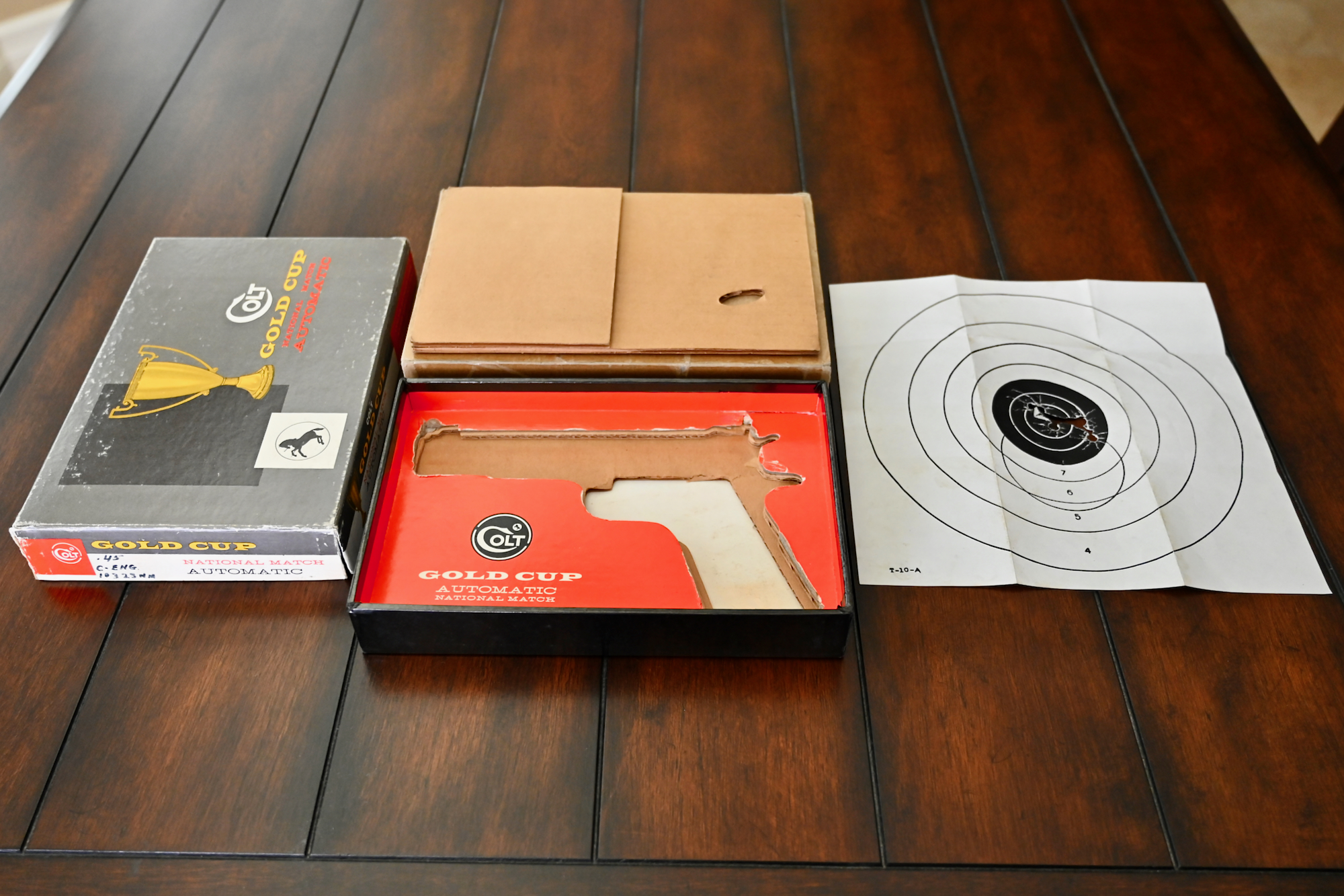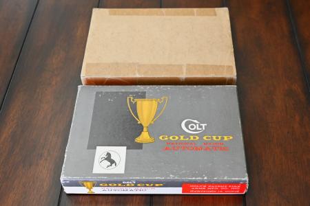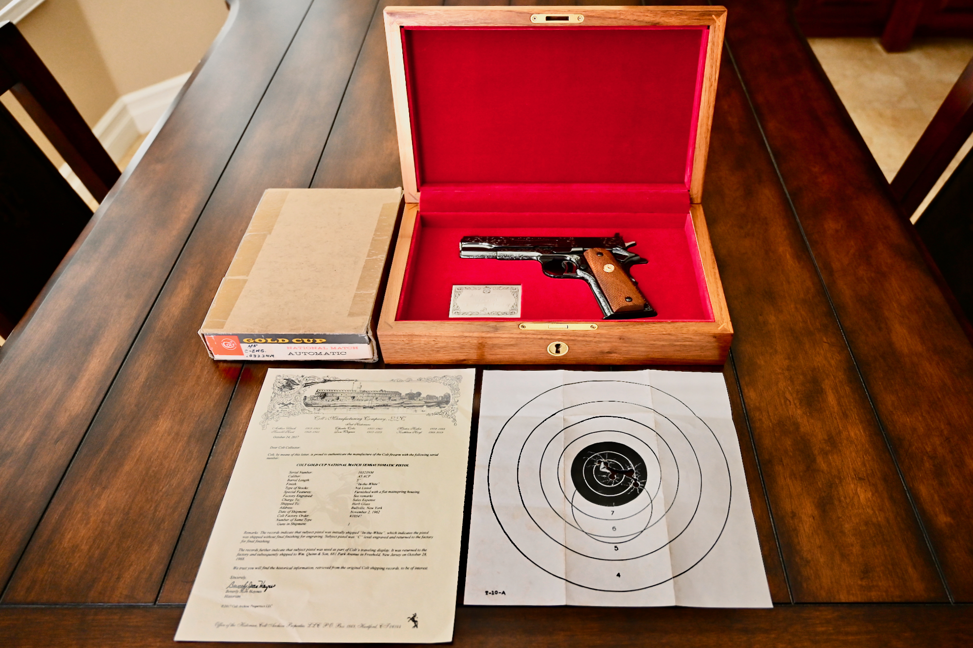 Overall condition is as close to 'flawless' as you can possibly get, and we would consider the gun to be N.O.S. (New Old Stock). The package includes the original two-piece Colt Gold Cup National Match box w/ the original shipping sleeve which is numbered to the gun, as well as the original factory test target, Colt walnut presentation case w/ red velvet lining, and the Colt Archive letter.