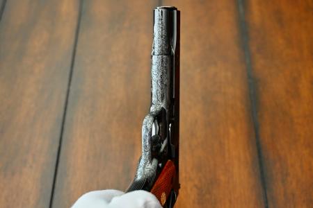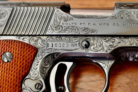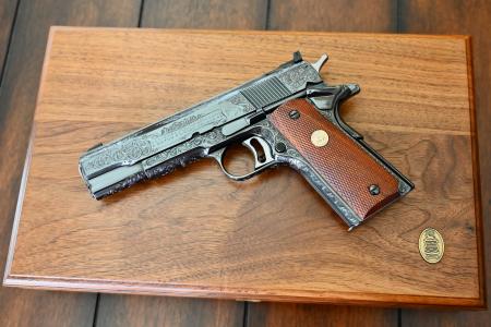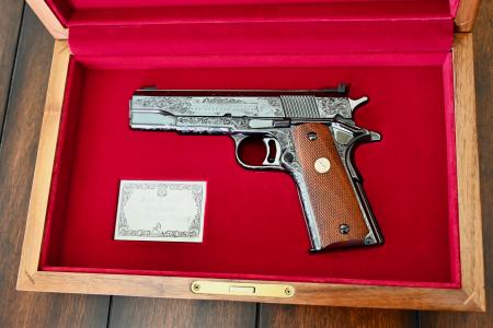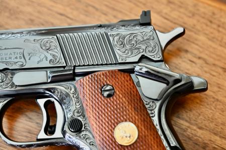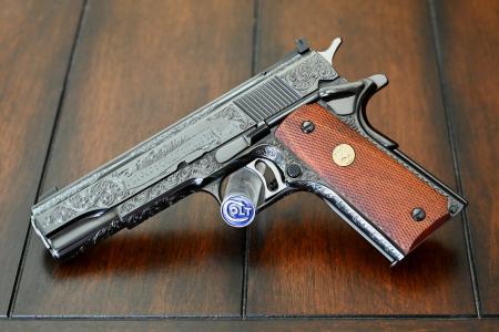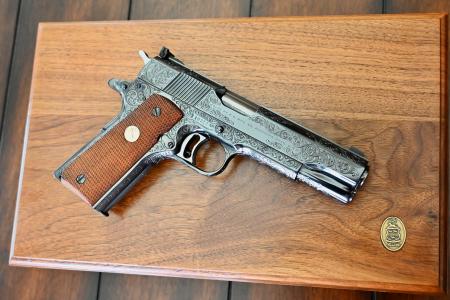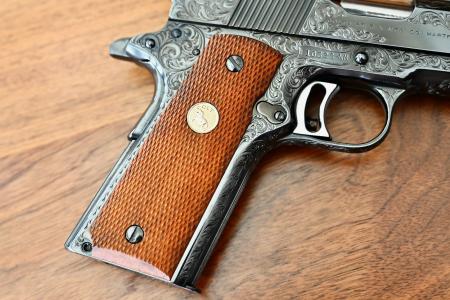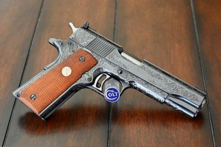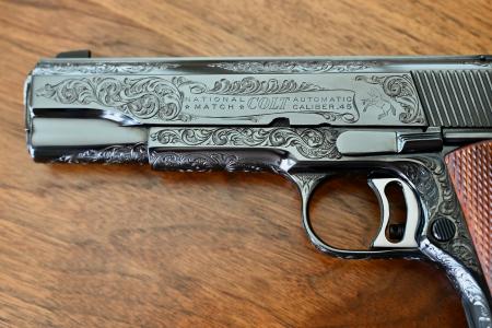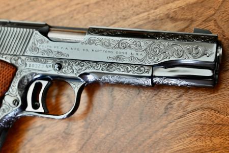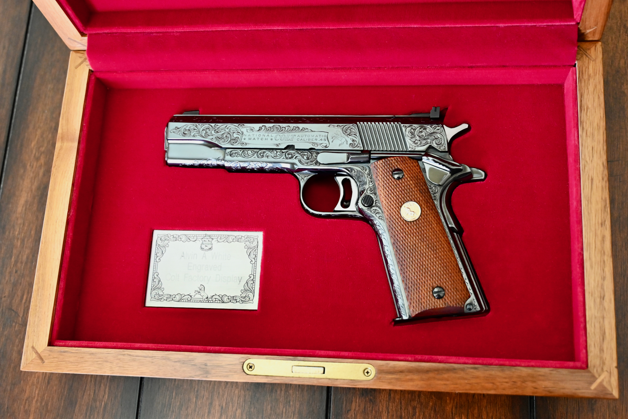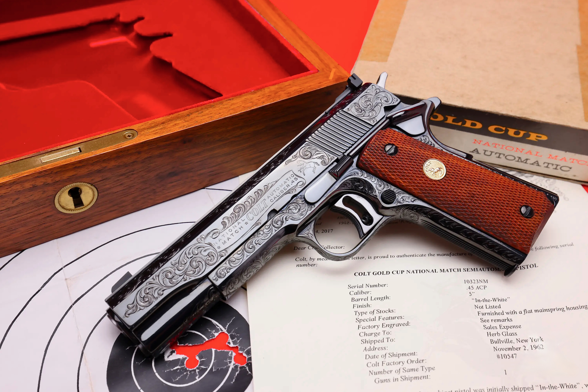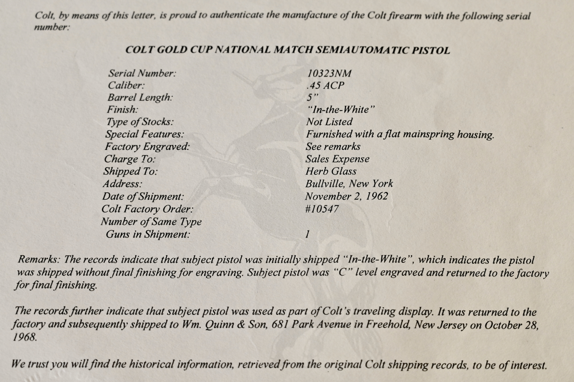 ‘Dirty Harry’ is very proud to present to you this spectacular 1962 Colt 1911 Gold Cup National Match .45ACP (Serial # 10323NM), factory engraved & signed by Colt Master Engraver Alvin A. White. We tend to find the term ‘Holy Grail’ to be kind of sappy, but if any Colt pistol that we have had over the years fits this term, it is certainly this one! Originally sold to reknown Colt aficionado Herb Glass on November 2, 1962, this pistol was shipped from the Colt factory 'in the white', whereas the metal is polished to a very high, bright, and reflective shine, but has not been plated or blued, meaning the bare, natural metal itself is visible. Mr. Glass then gave the pistol to the legendary Alvin White for a beautiful 'C' Level engraving, and then Colt did the final deep-blue high-polish finish. Subsequently, Colt ended up keeping the pistol for the next three years (1962-1964) as a ‘Show Gun’ for their Traveling Display. It was then returned to the factory and eventually sold on October 28, 1968, to WM Quinn & Son of Freehold, New Jersey.
