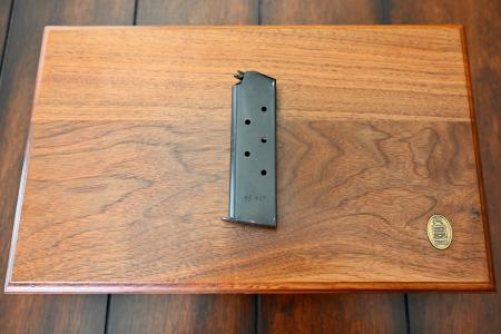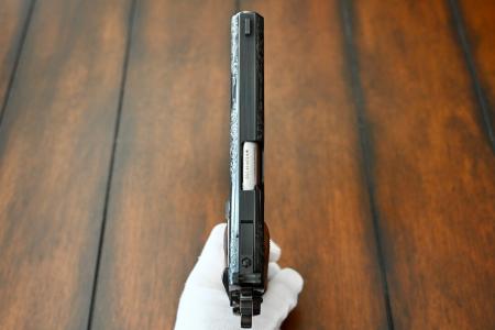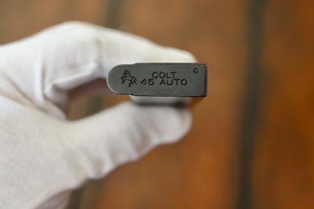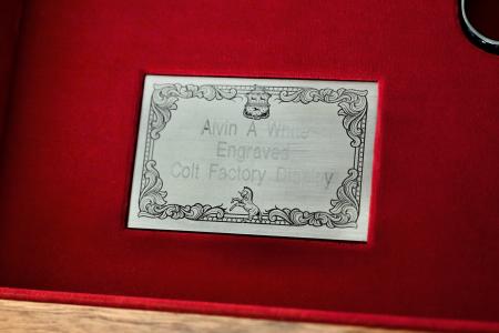 This pistol is an absolute show-stopper folks. Alvin White adorned the frame w/ Class 'C' coverage, floral scroll engravings w/ punch-dot backgrounds, all expertly executed, and he signed the grip frame w/ his 'AAW' trademark under the right grip panel. Chambered in .45ACP w/ a 5” barrel, this exceptional pistol features a fixed blade front sight and adjustable rear sights, and of course a ‘National Match’ marked barrel. It was fitted w/ a gorgeous set of finely checkered walnut stocks w/ gold medallions, as well as a blued magazine marked w/ the Rampant Colt as well as ‘COLT/.45 AUTO’ on the base.