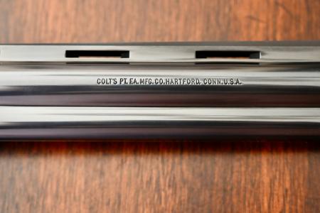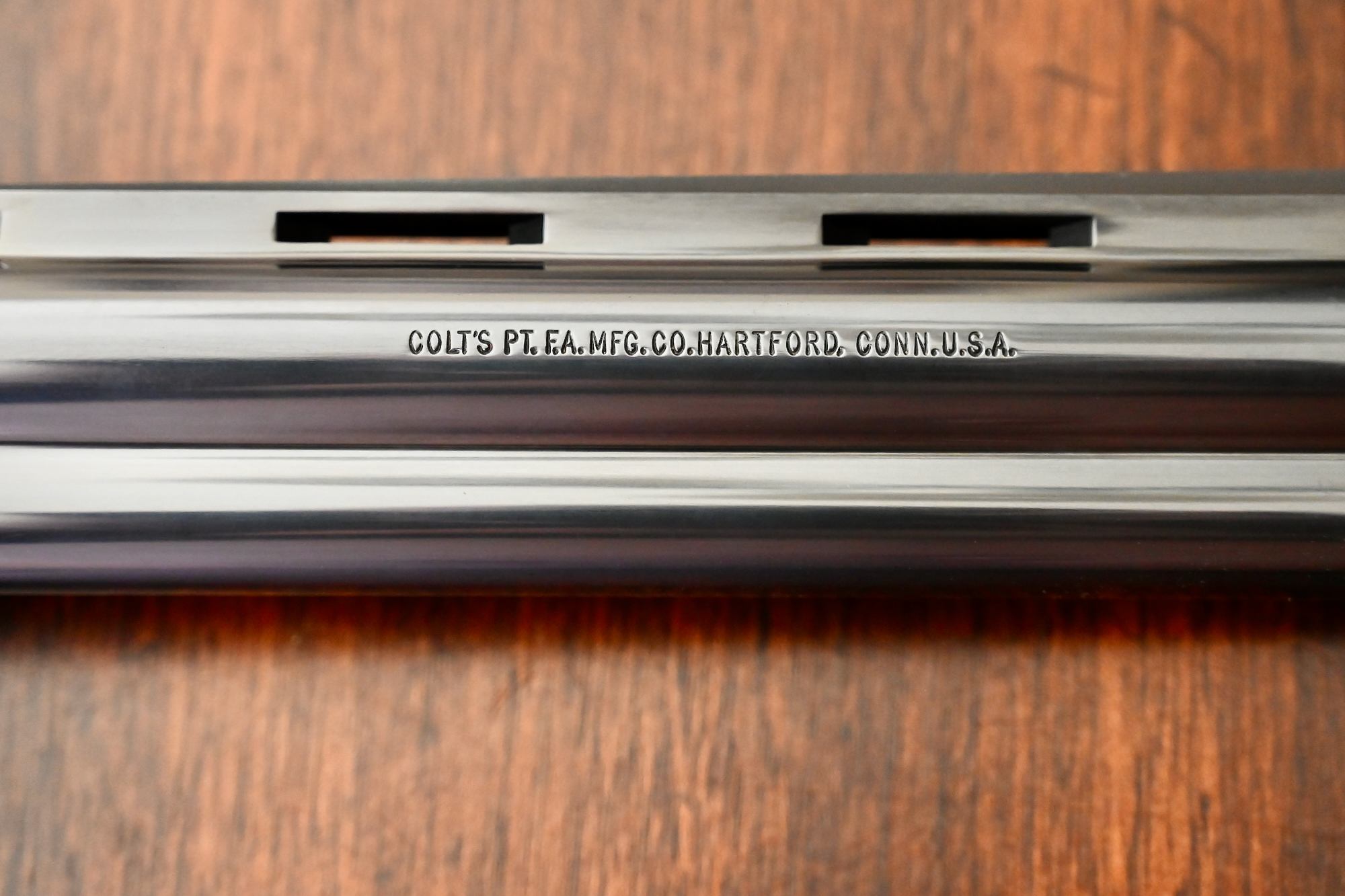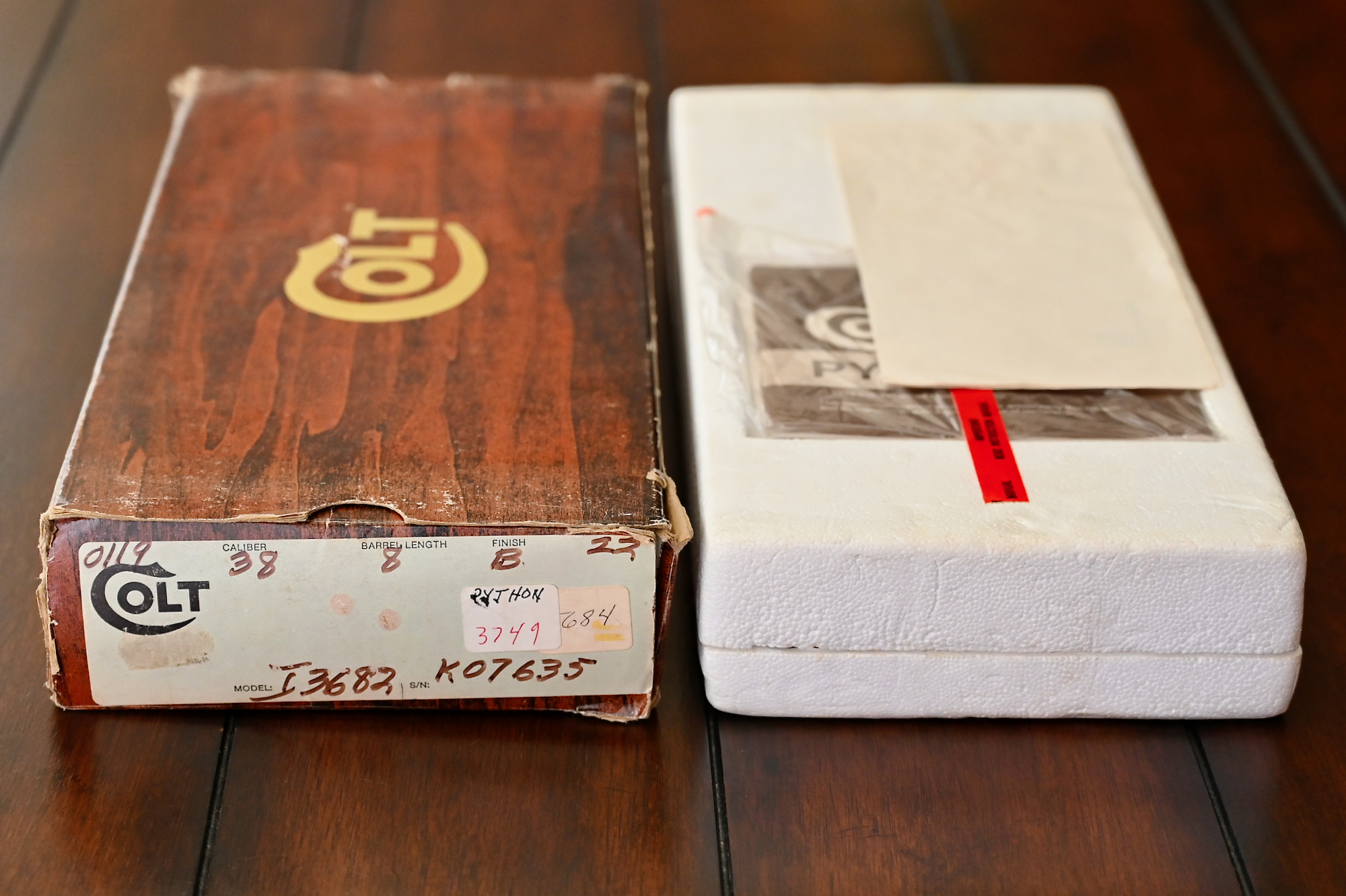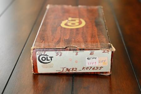 The package is 100% complete, including the original faux woodgrain Colt box (numbered to the gun) w/ foam insert, as well as the factory original Colt paperwork, which is still taped to the foam insert.