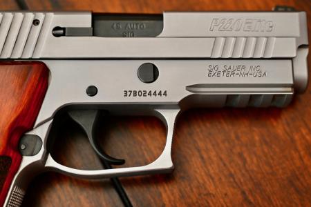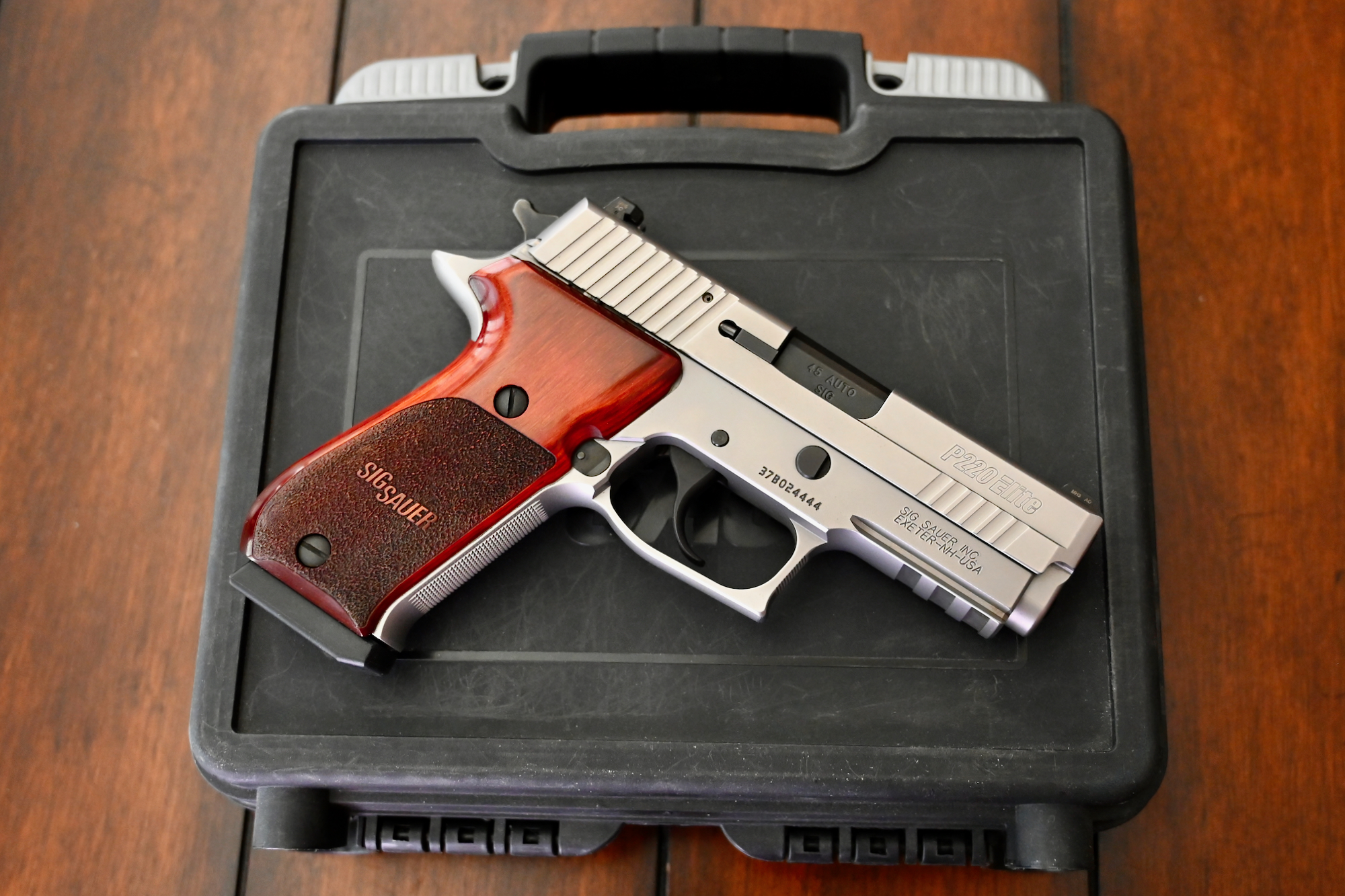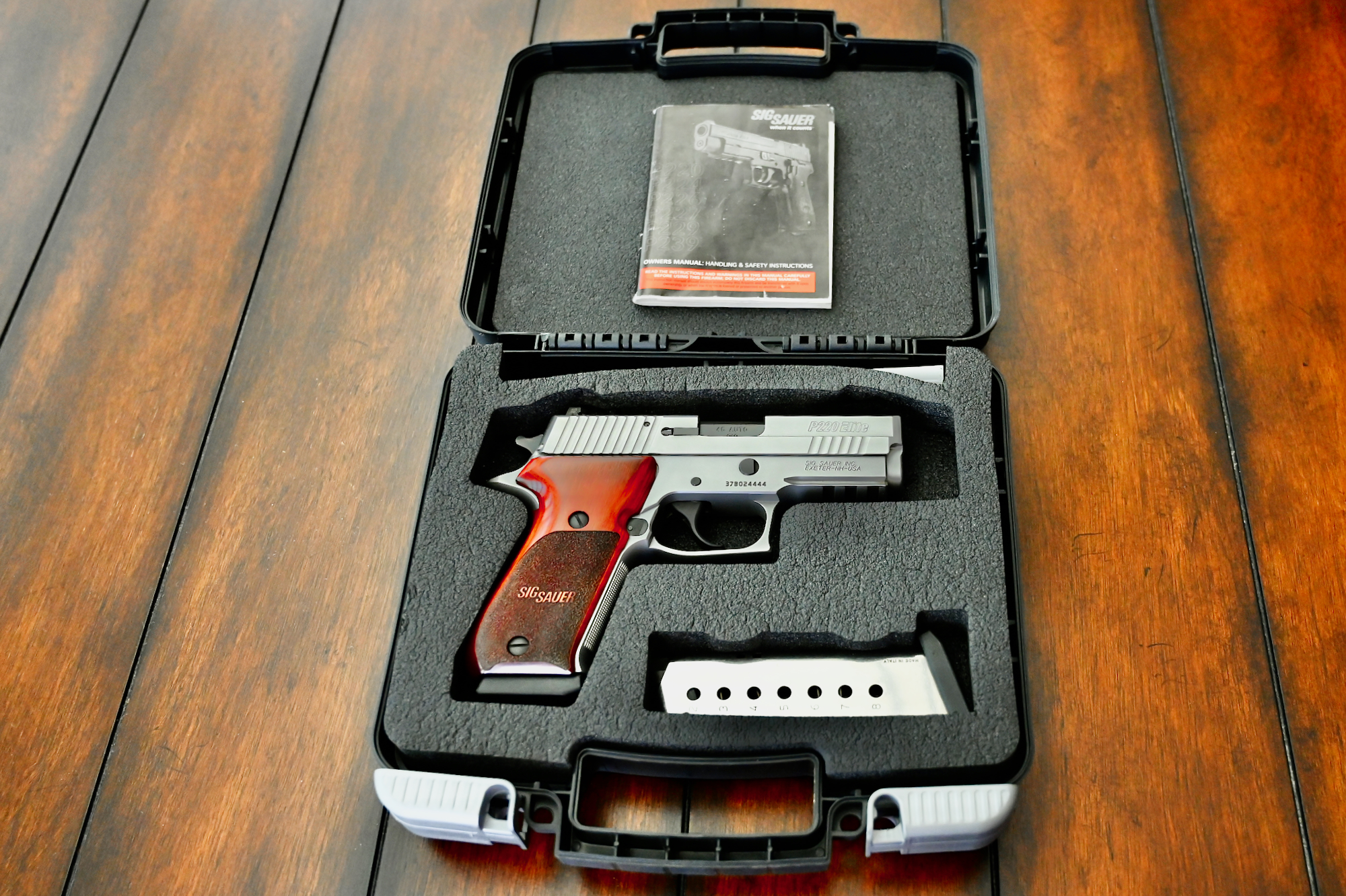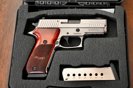 This particular pistol, serial # 37B024444, is in pristine condition throughout, and looks to have been used very little if any at all. She still resides in the original Sig Sauer black plastic case, which is numbered to the gun, and includes the original Sig Sauer P220 owner’s manual.