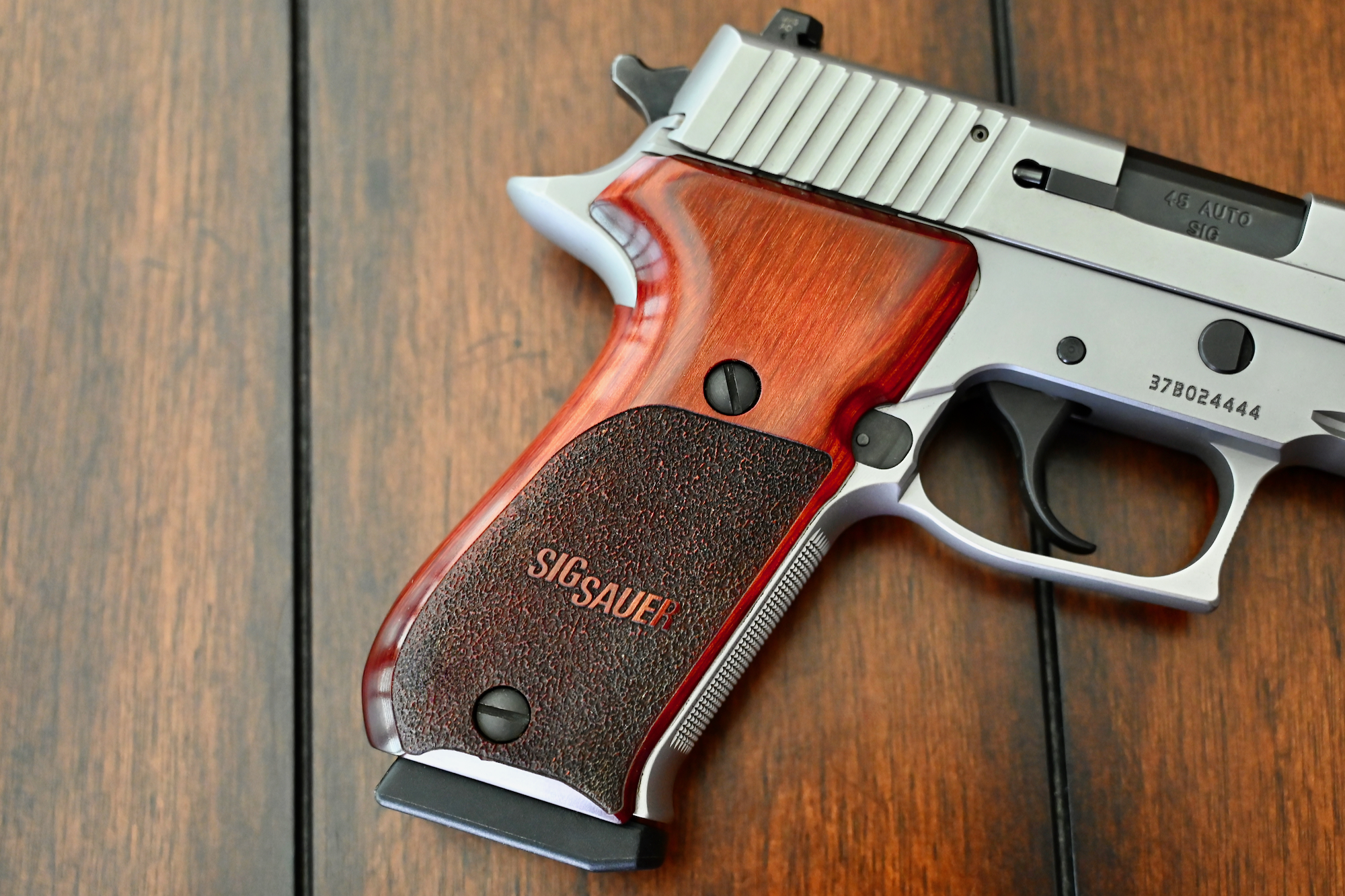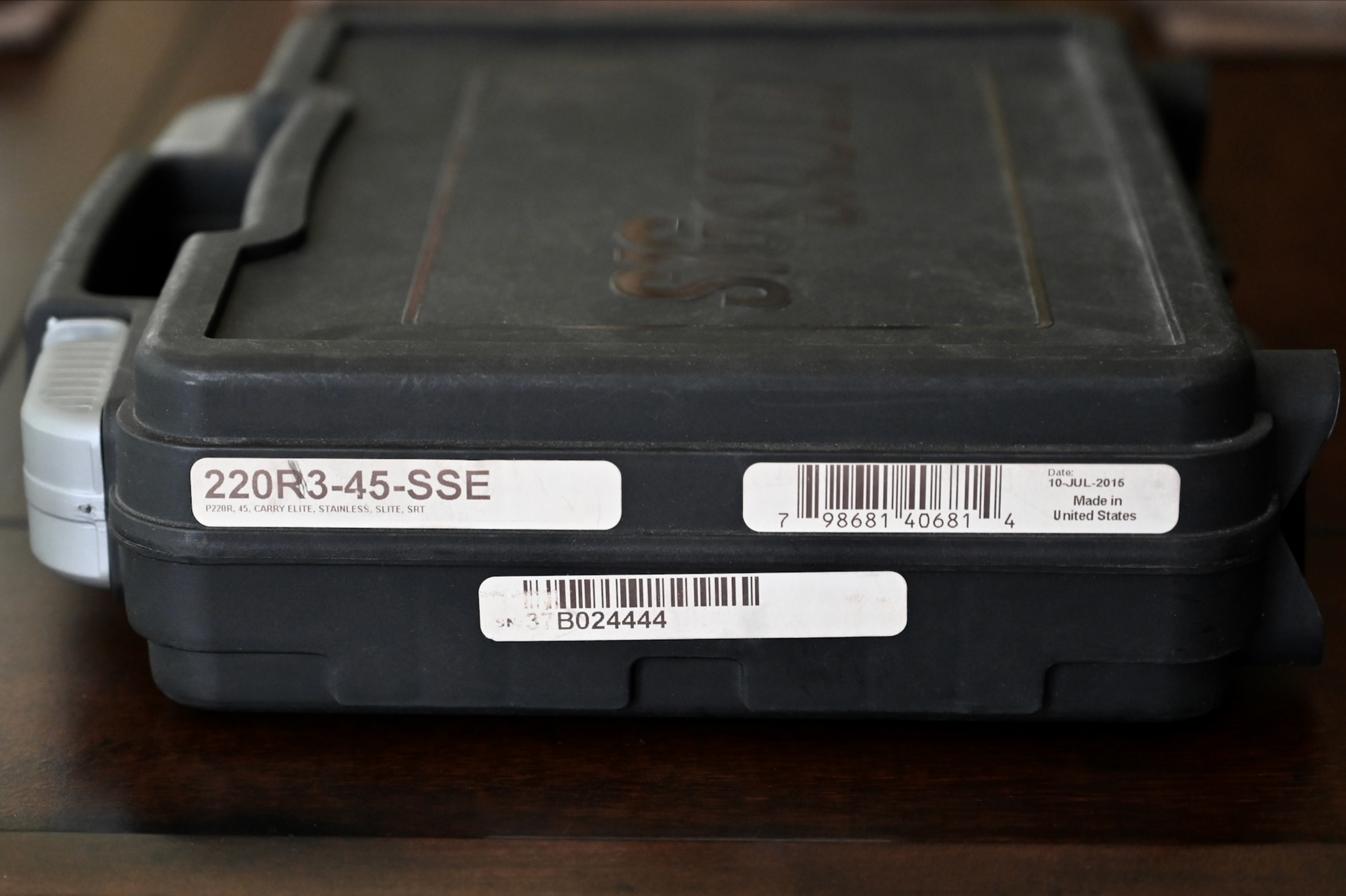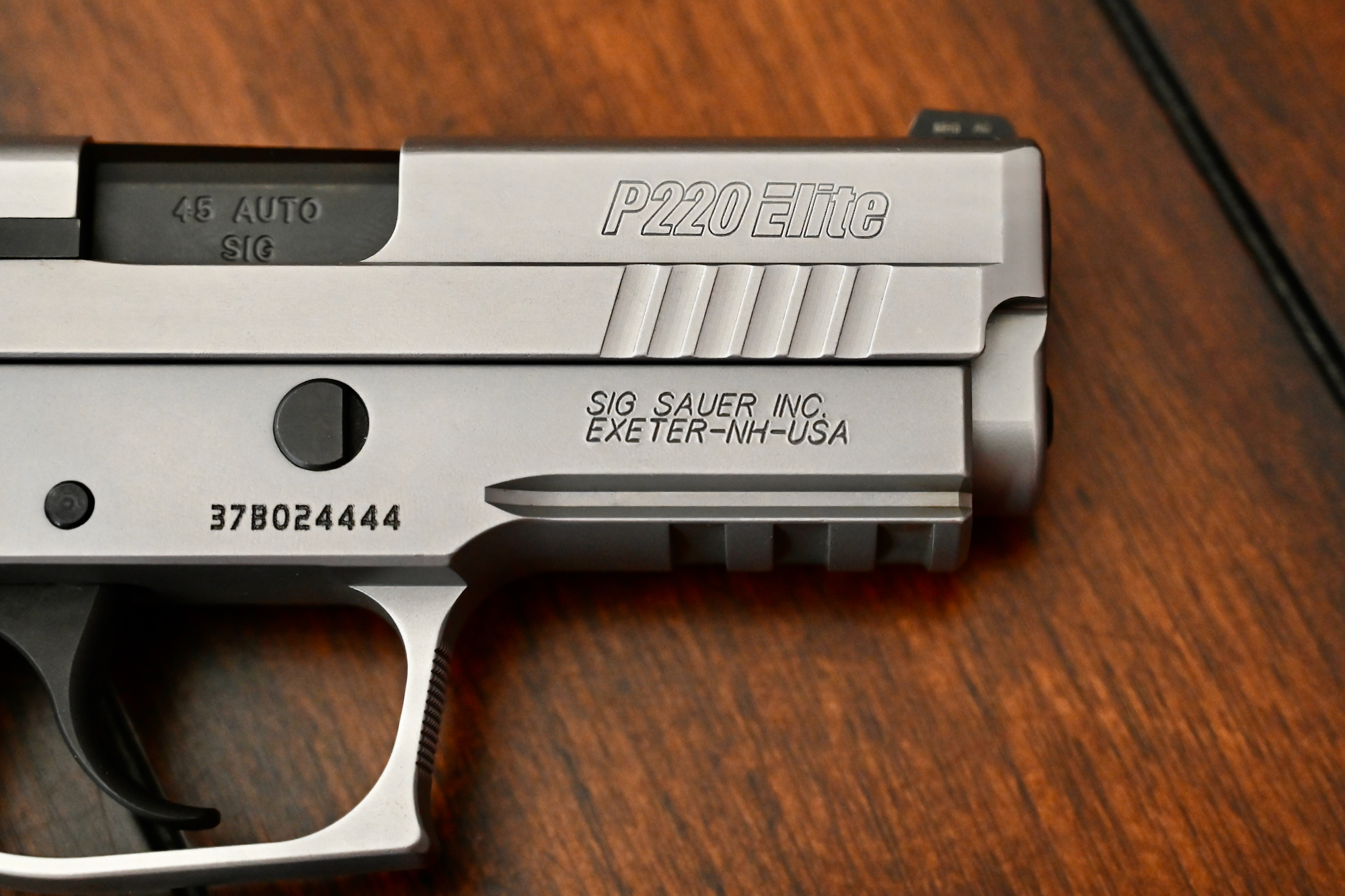 This particular pistol, serial # 37B024444, is in pristine condition throughout, and looks to have been used very little if any at all. She still resides in the original Sig Sauer black plastic case, which is numbered to the gun, and includes the original Sig Sauer P220 owner’s manual.