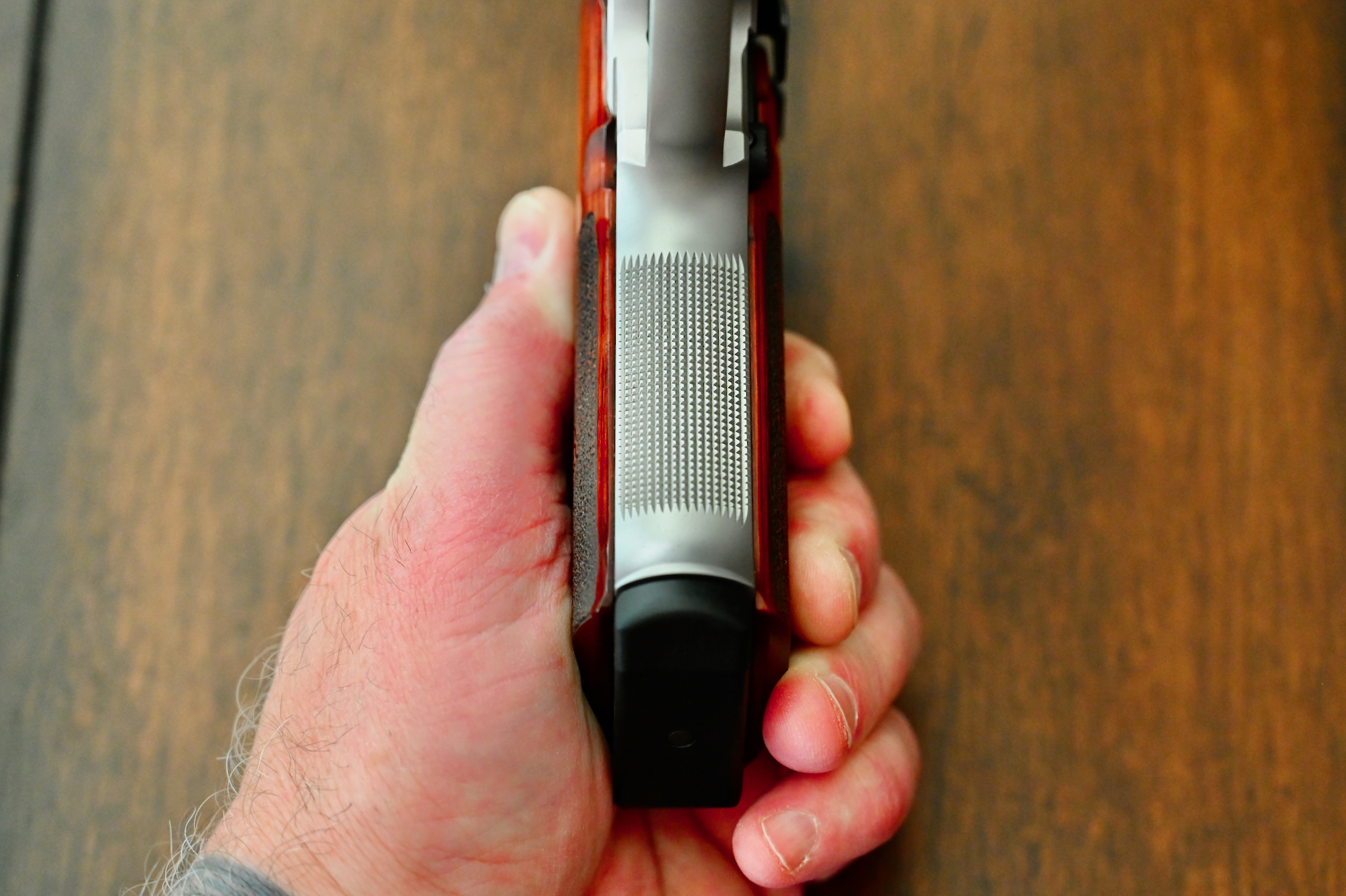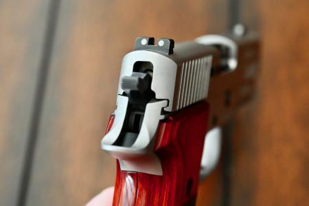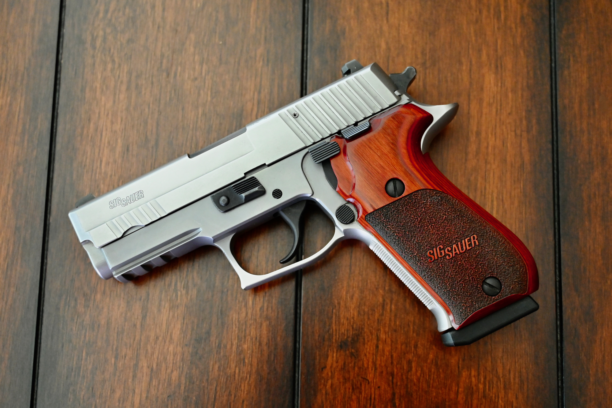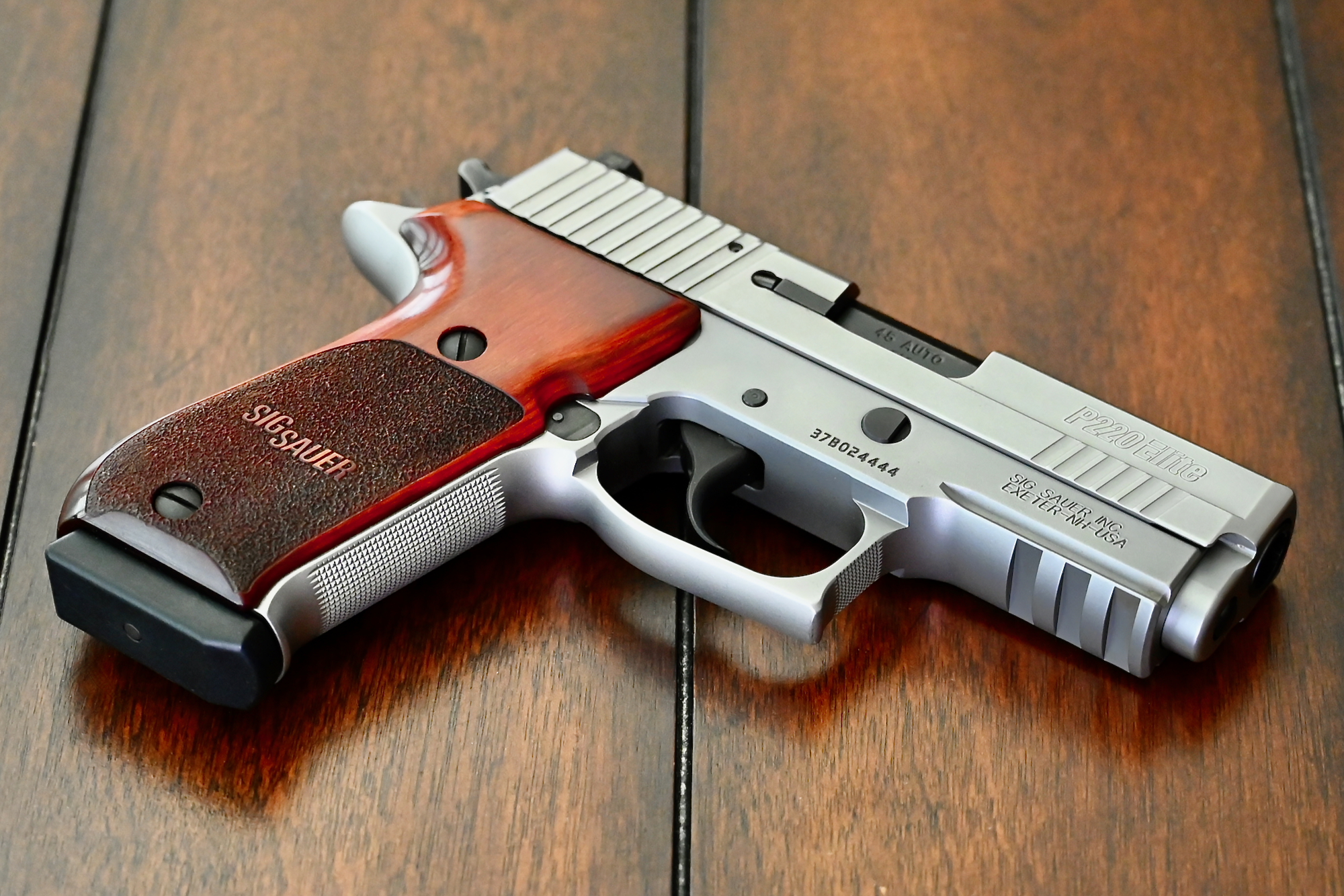 Chambered in .45 ACP, features include: 3.9” barrel, all stainless-steel construction (for reduced recoil), Sig Sauer Short Reset Trigger (SRT), SIGLITE night sights, 8+1 capacity, and custom Rosewood stocks. With the enhanced ergonomic features of a beavertail grip, front strap checkering, and front cocking serrations, the P220 Carry Elite is an excellent choice as a big-bore carry pistol. Not to mention that they are absolutely beautiful!
